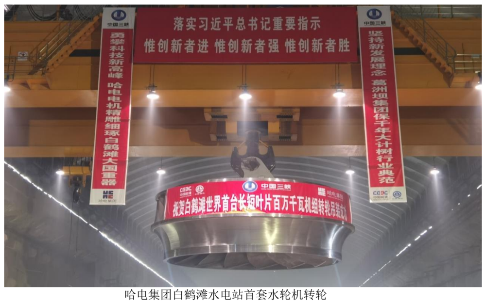 白鶴灘水電站是全球單機容量最大、在建規(guī)模最大的水電站,是開發(fā)和治理長江上游的重要水電工程,是國家能源戰(zhàn)略布局“西電東送”的骨干電源點,是長江防洪體系的重要組成部分,該工程由三峽集團建設(shè)并管理。水電站裝機總?cè)萘?1600萬千瓦,左右兩岸共安裝 16 臺 100 萬千瓦水電機組,右岸 8 臺 100 萬千瓦機組由哈電集團研制,左岸 8 臺 100 萬千瓦機組由東方電氣研制。