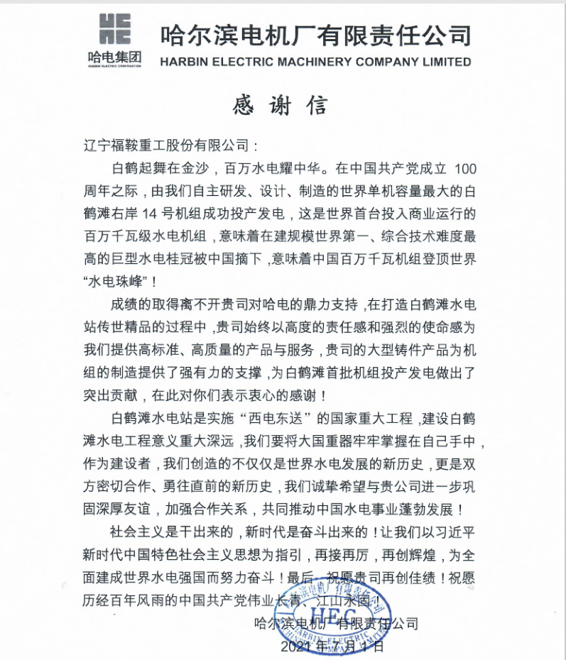 福鞍股份為白鶴灘 水電站機組提供鑄造核心零部件——哈電集團給福鞍發(fā)來感謝信